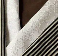 裏地つきのレース半襟です。レースのオフホワイト部分は光沢なし、グレーの部分は銀糸でキラキラしています。実物は写真よりもシルバー部分がキラキラしています。華やかさもありますが、落ち着きのあるキラキラ感です。成人式の振袖などにも◎