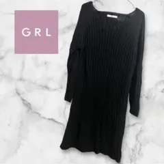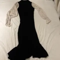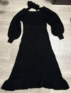 リブ編みデザインのニットワンピース、バルーンスリーブとサイドスリットが特徴です。