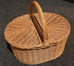 ラタン風のピクニックバスケットに白い食器とプラスチック容器がセット。