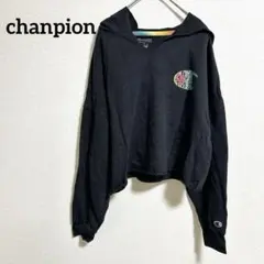ジップアップデザインのネイビーのスポーツウェア、ストライプとChampionロゴが特徴。