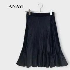 シンプルなデザインの黒いプリーツスカート、ひざ丈で多様なスタイルに合わせやすい。