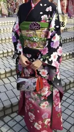 人気カラー色無地振袖を黒袋帯で全身コーディネートした豪華6点セットでのご案内です。