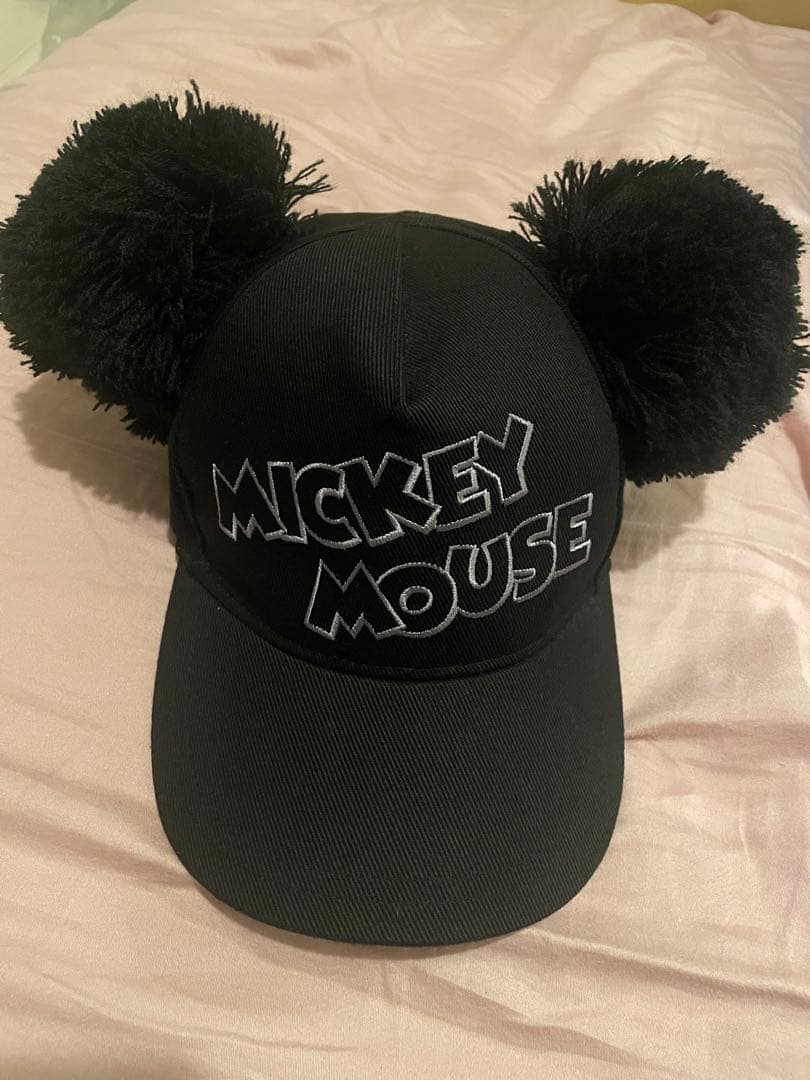 ミッキーマウスのポンポン付き黒キャップ。