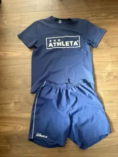 青いサッカーシャツとショートパンツのセット、ATHLETAのロゴ入り。