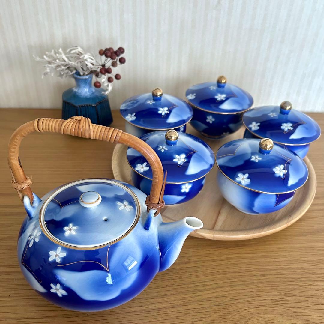 有田焼•清右衛門作 特選 藍花蝶紋 湯呑五客•急須セット
