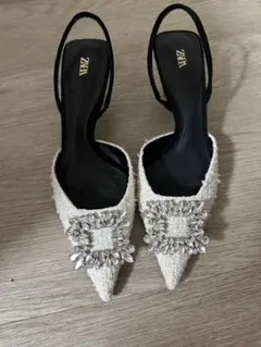 フリンジデザインのベージュサンダル、低ヒールで履きやすいです。