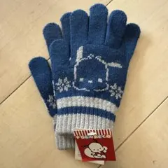水色のフリース手袋、ファー付き、サンリオ ウサハナ刺繍。