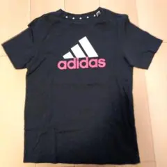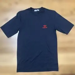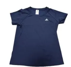 ネイビーのadidasロゴ入りTシャツ、ラグラン袖デザインで快適な着心地。