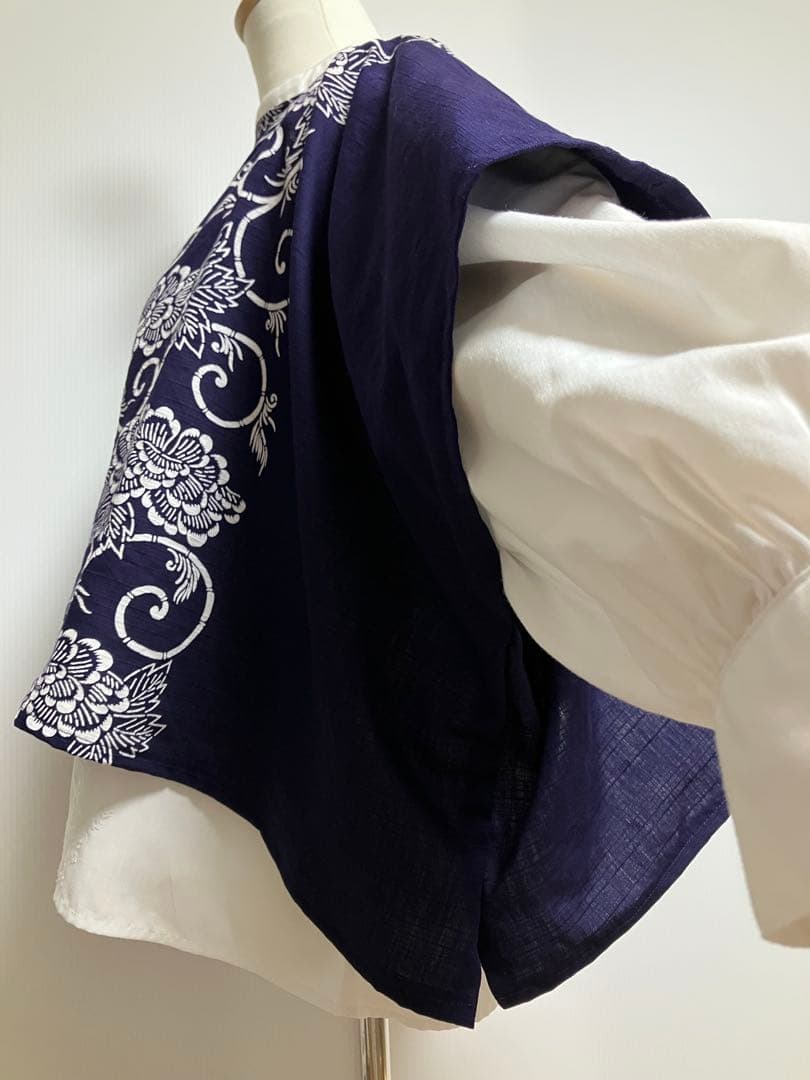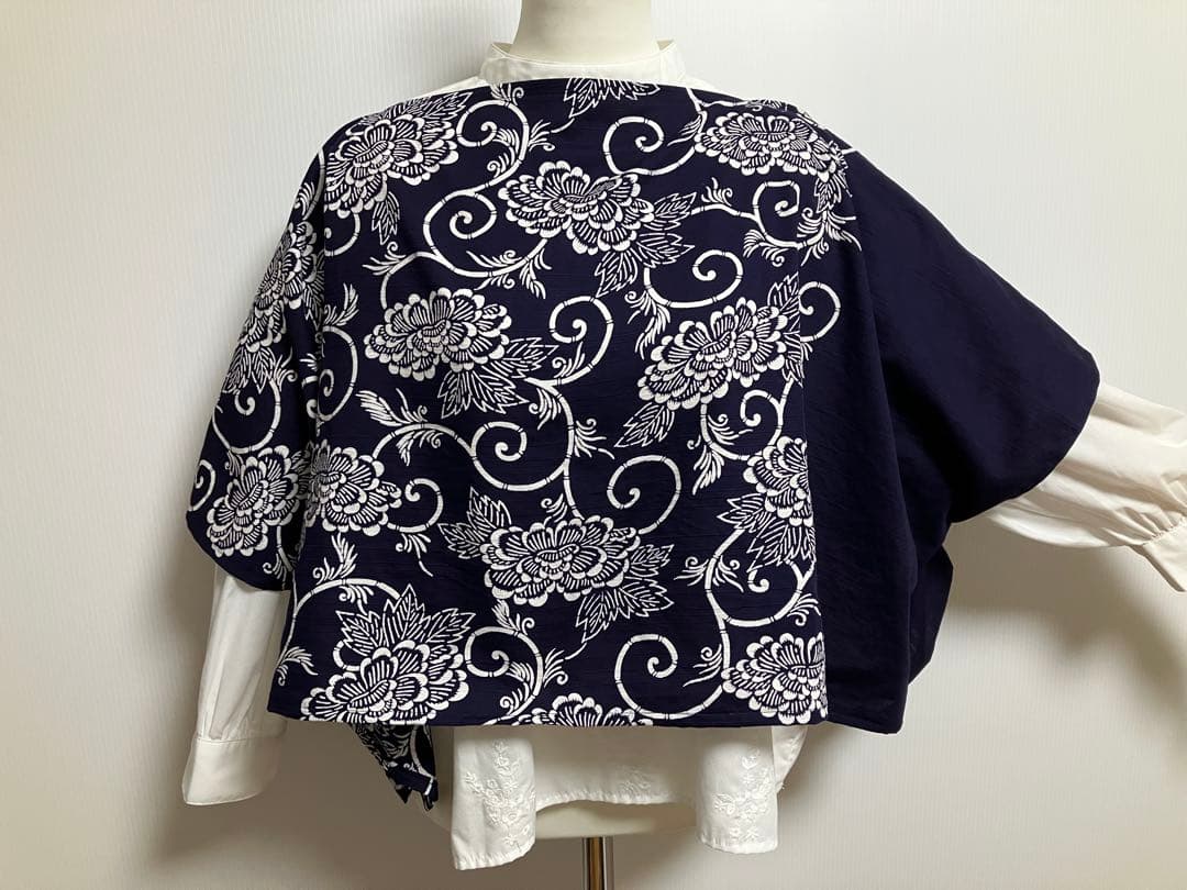 古布風呂敷リメイク ブラウス ポンチョ ベスト 濃紺✖️白 牡丹唐草模様 木綿