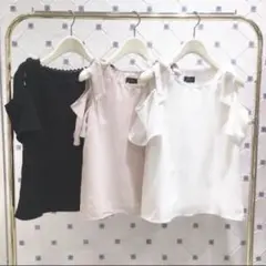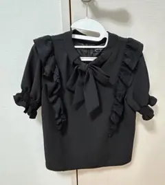 薄紫のフリル付きパフスリーブブラウス、スクエアネックデザイン。