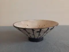 灰色の陶器製の丸い花瓶、抽象的な茶色の模様付き。益子焼
