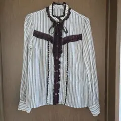 フリル付きのシフォン素材のホワイト長袖シャツ。