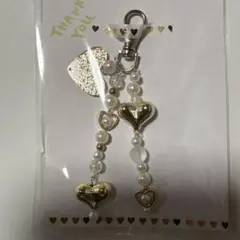リボンとハートのチャームが特徴のハンドメイド携帯ストラップ。