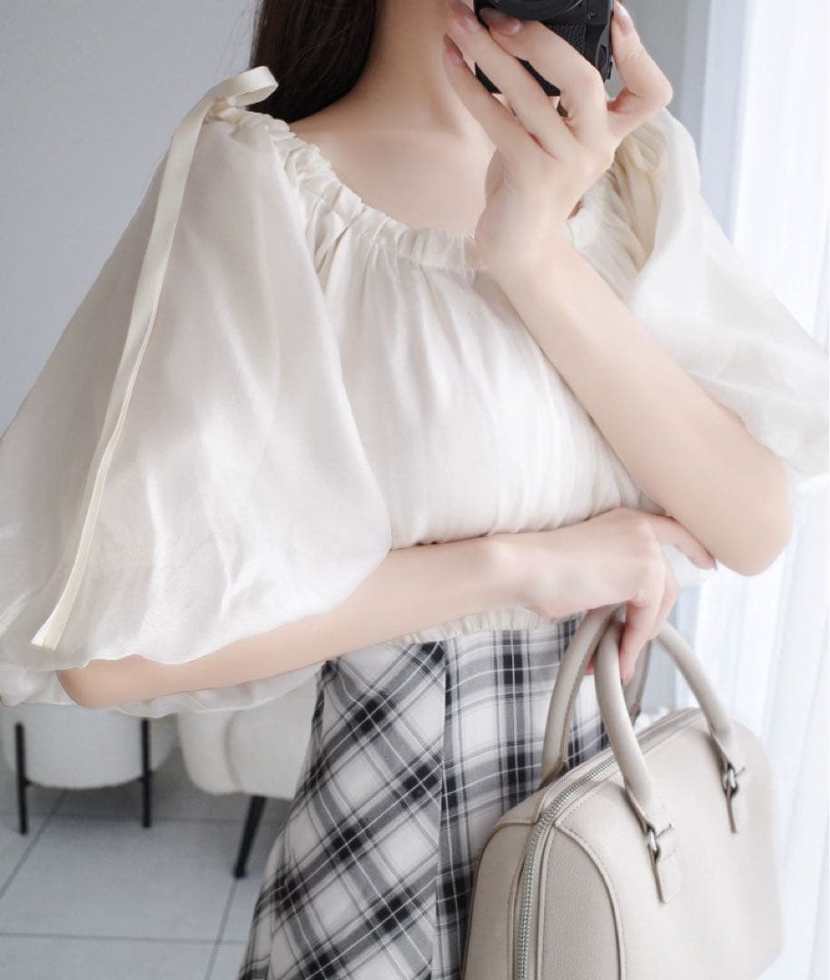 オフショル2wayリボン使いシャイニーシアー袖チェック柄ドッキングワンピース。