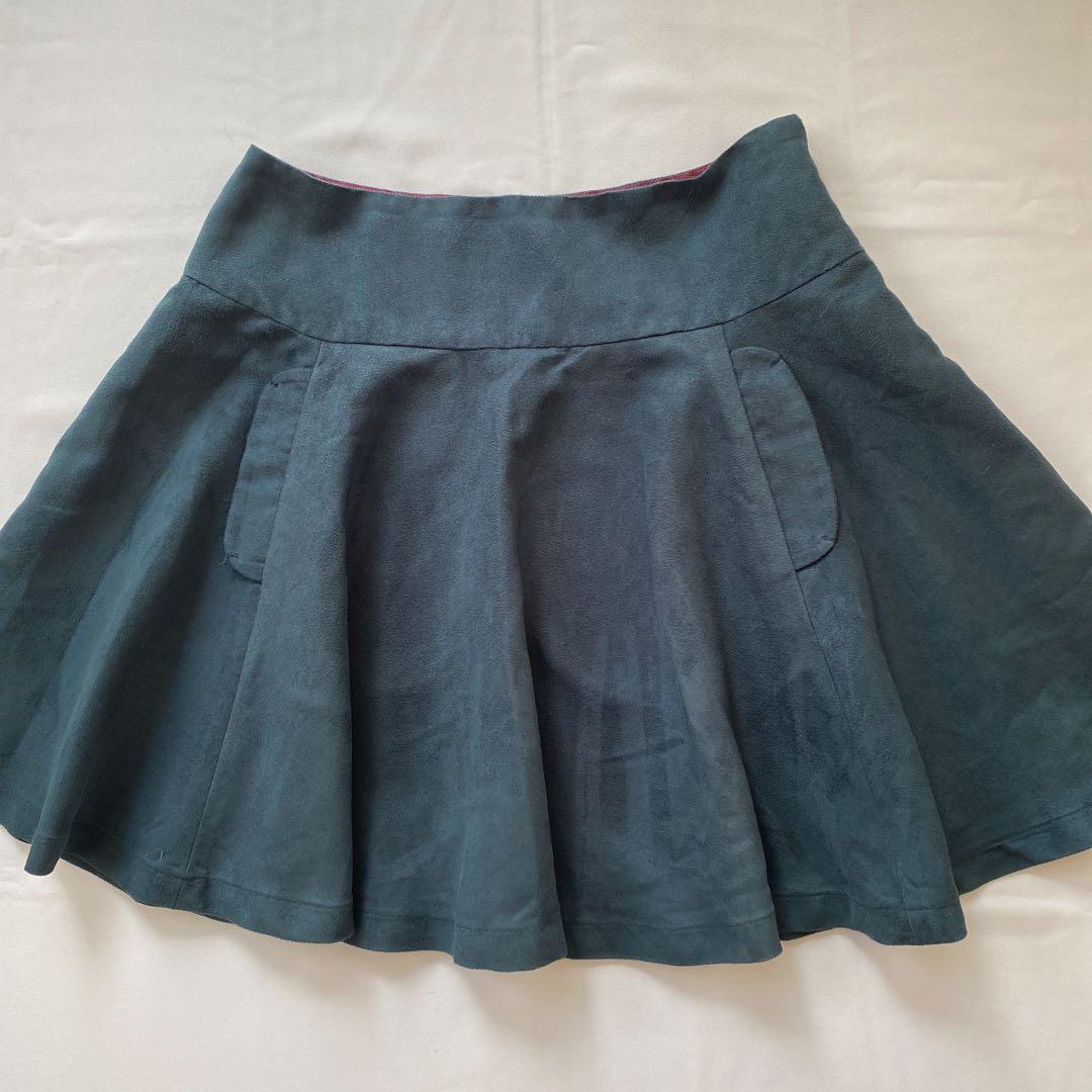 ダークグリーンのフレアスカート、前面の両脇にポケット付きでスタイリッシュ。