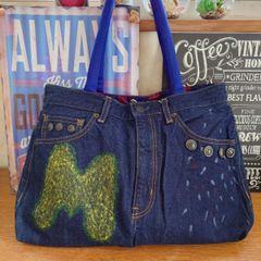 リメイクデニムを使用したハンドメイドトートバッグ。