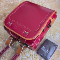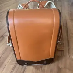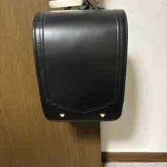 合成皮革製の黒いフラップ式ランドセル、内部ポケット付きで調整可能なストラップ。