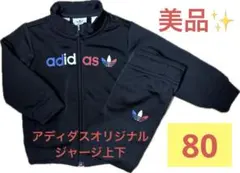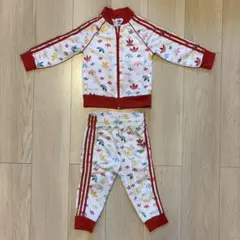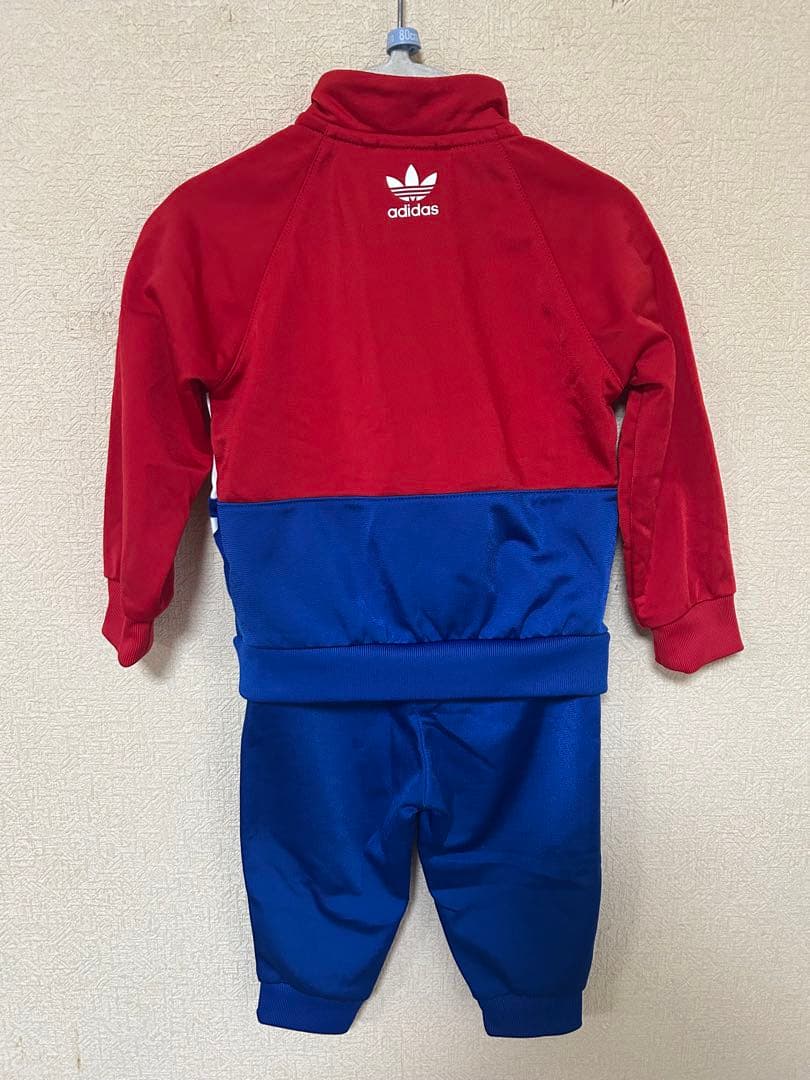 鮮やかな赤と青のadidasトラックスーツ、80cmサイズ、三本線ロゴデザイン。