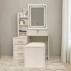 北欧風 ライディングミラー LED三色変更 大容量収納ペース スツール付き 鏡台 タッチ操作 一面鏡 組み立て説明書付き