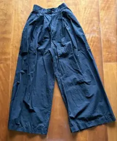 ややハイウエストでウエストバック平ゴムギャザー+ドローコード入り、1タック入りで広めのわたり〜裾に向かって緩やかにテーパードされたクロップ丈パンツです。