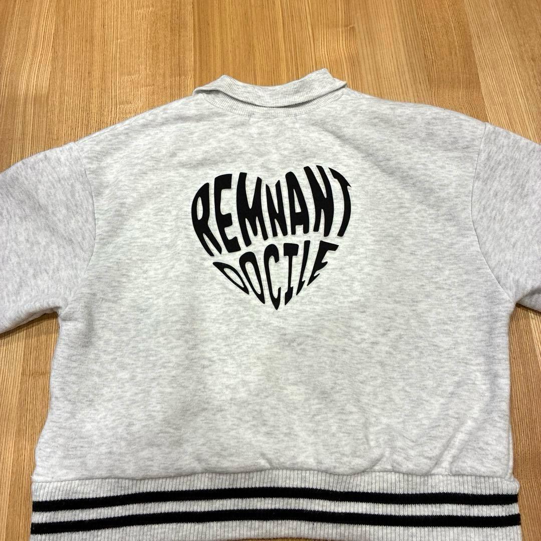 グレーのハーフジップトレーナー、刺繍デザイン、ストライプ裾付き。