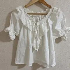 水色のフリル付き半袖シャツ、カジュアルスタイルに最適。