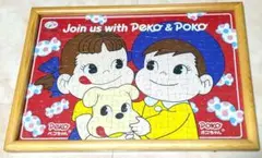ペコちゃんとポコちゃんのイラストの缶の赤いボックス。