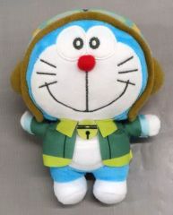 青いドラえもんのぬいぐるみ、笑顔で赤いジャケットを着用、約26cmのサイズ。