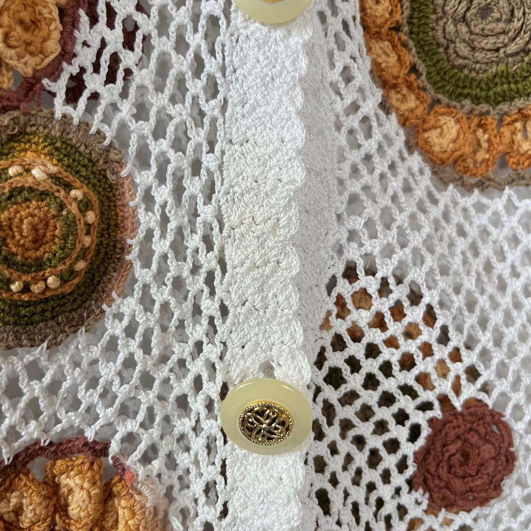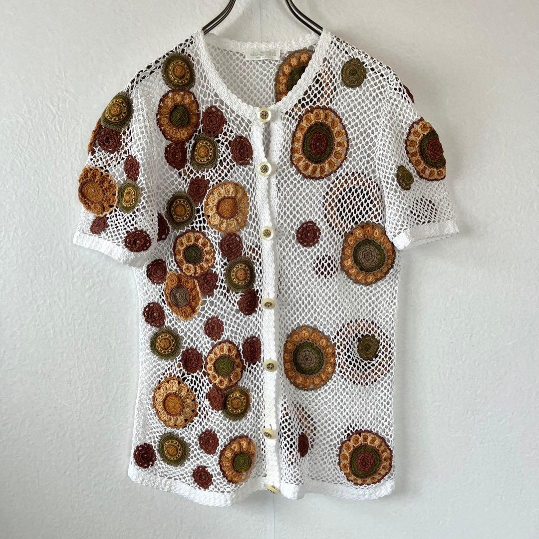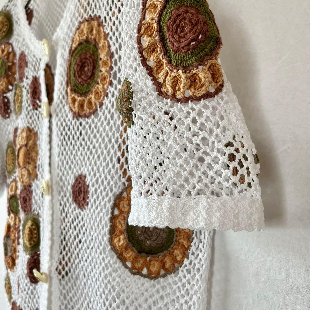 古着 クロシェカーディガン 半袖 M 花柄 模様編み かぎ針編み レトロ 白
