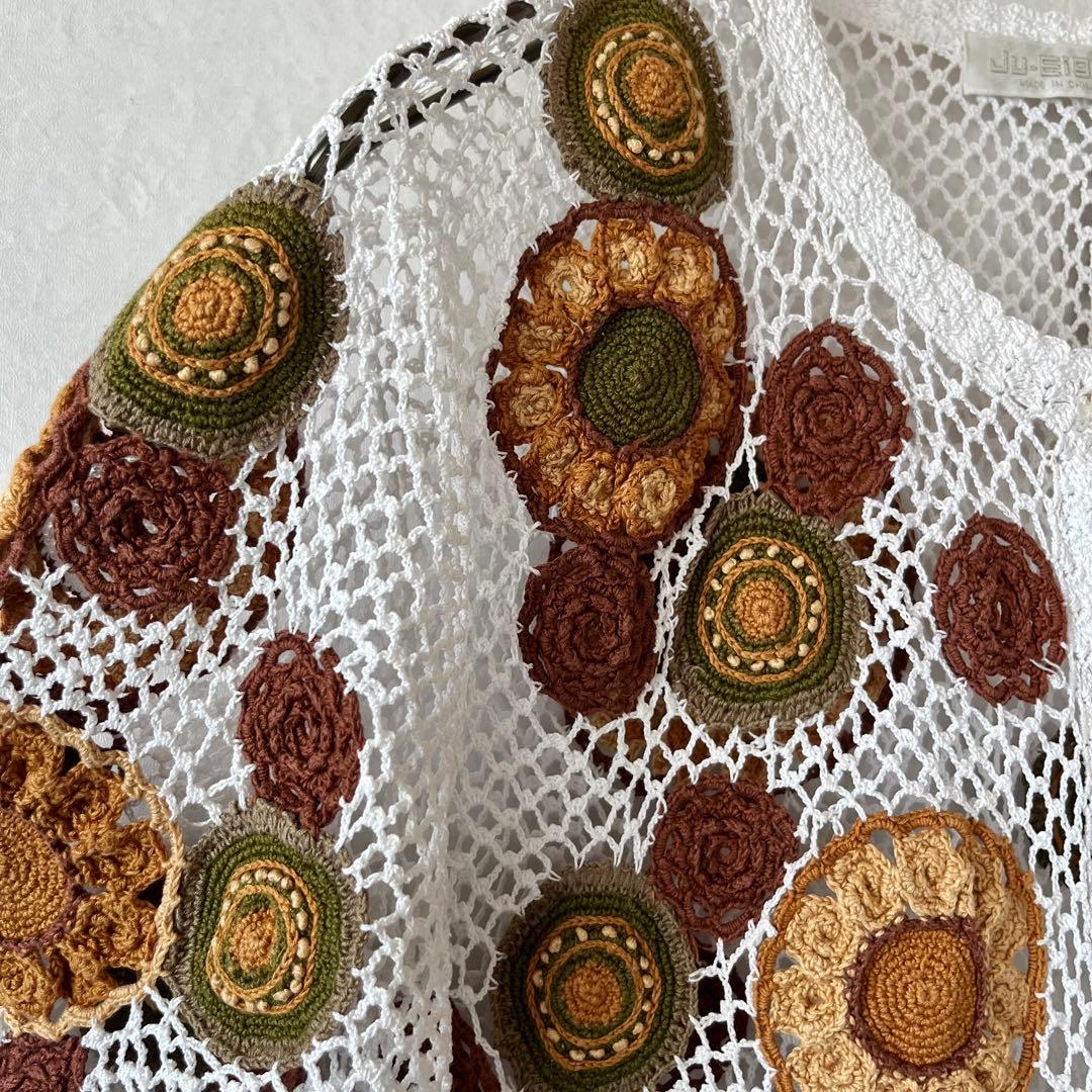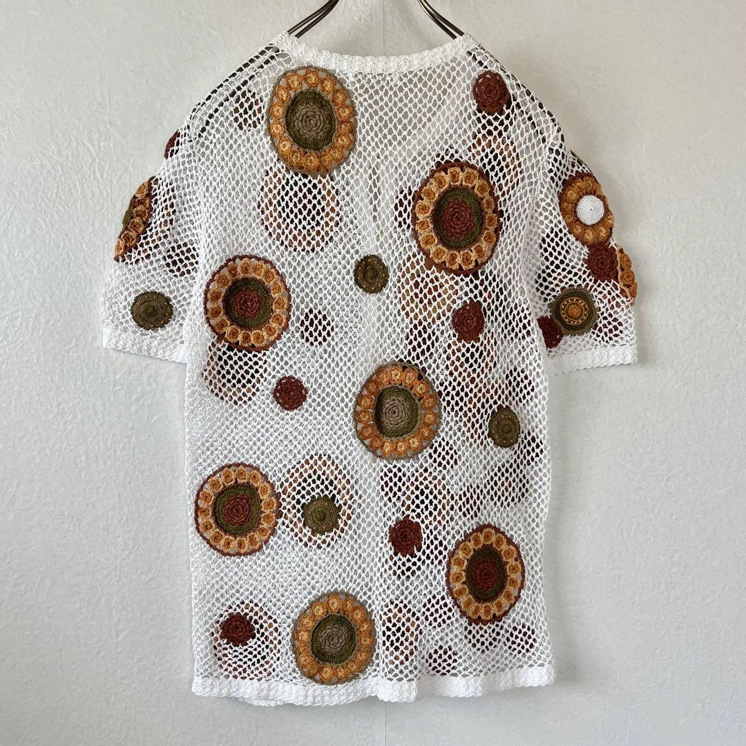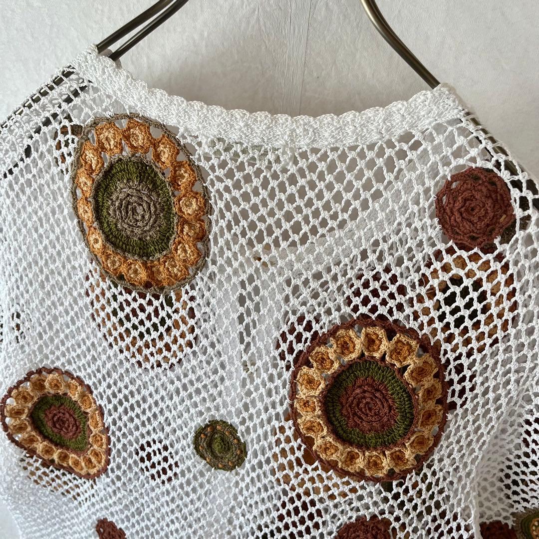 古着 クロシェカーディガン 半袖 M 花柄 模様編み かぎ針編み レトロ 白