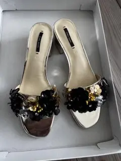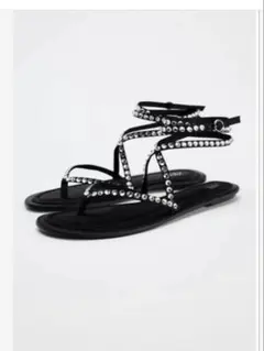 メッシュ素材のブラックサンダル、スタイリッシュでエレガントなデザイン。
