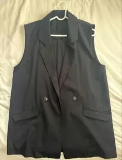 黒と白のツイード素材で、ボタンとポケットが特徴のベスト。