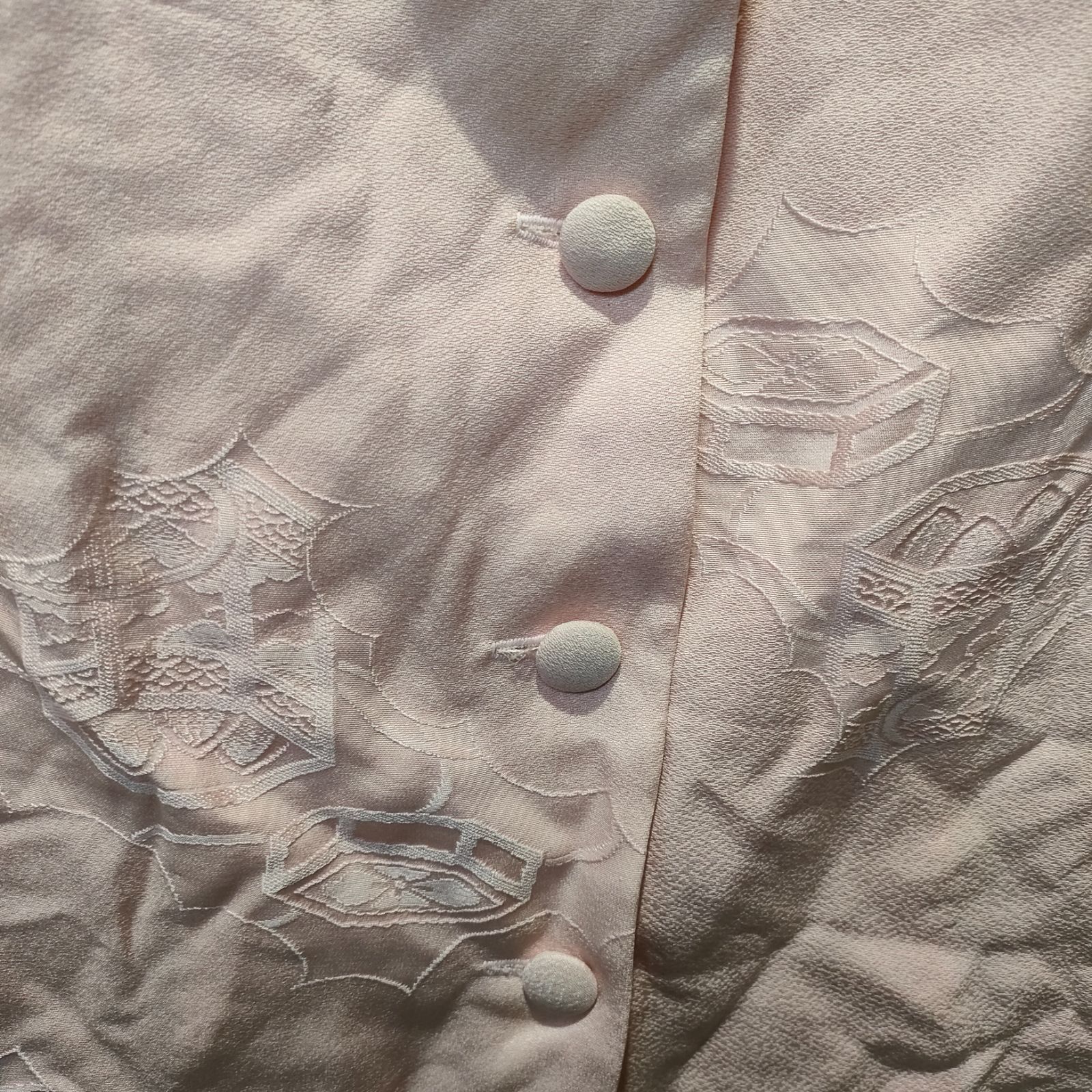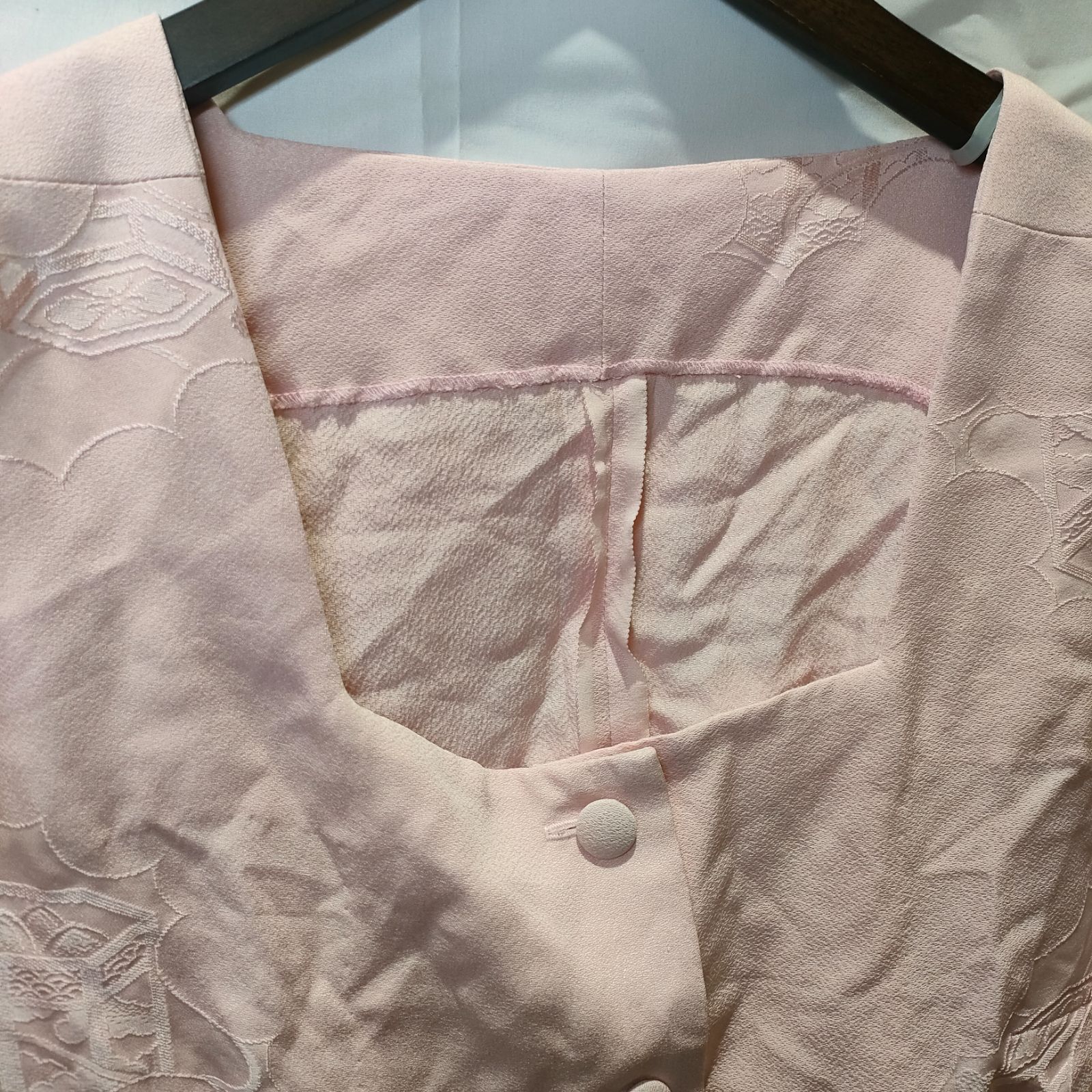 18【リメイク】古布 和柄 ベスト トップス くるみボタン ピンク 羽織 重ね着 着物地 ハンドメイド アンティーク ビンテージ 和装 着物 浴衣 手作り 和服 昭和 レトロ 婦人服 一点物 JAPAN 日本 レトロ